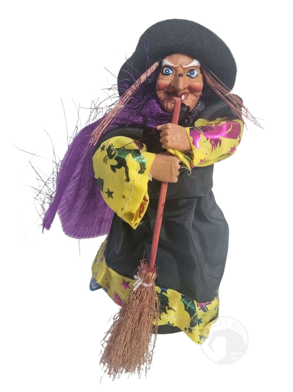 Melinda, a bruxa encantadora! 🧙♀️ Bruxa decorativa com vestido amarelo estrelar, capa roxa e chapéu preto. Segura uma vassoura mágica! Perfeita para decoração temática de Halloween.